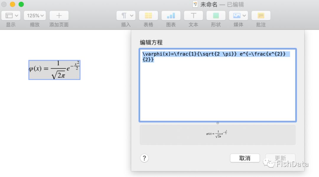 因为word默认不支持LaTex公式,本文先以在Apple Pages文稿为例,说明插入公式的方式。新建一个文档,然后选择「插入->方程」,直接在方程窗口中写入以LaTeX语法表述的公式即可。其中在编辑框中输入以下的代码即可。