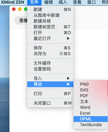 要进行批量修改,首要的工作就是进行文本化,在文本文件中就可以使用编辑器软件对内容做批量处理。这样我们可以用到XMind提供的将文件导出为OPML文件的方式。