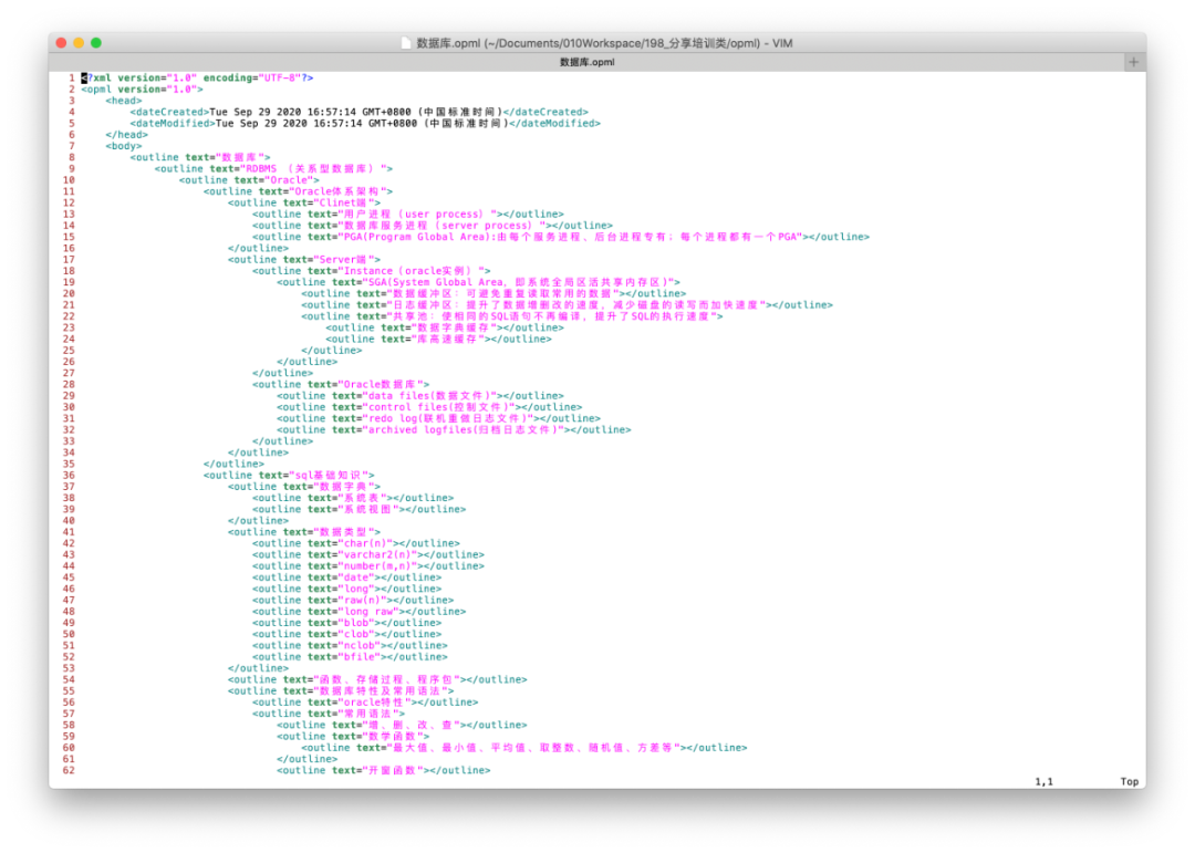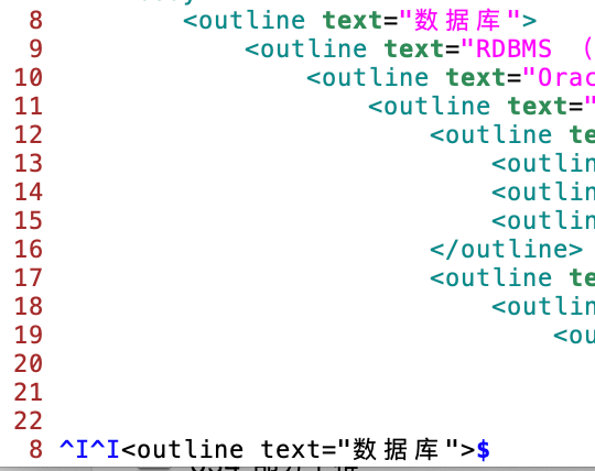 接下来,就是用你趁手的文本编辑器打开导出的OPML文件,我这边常用VIM,所以就用VIM打开这个文件。其它的编辑器使用起来大同小异,只要支持正则表达式替换就可以完成任务。