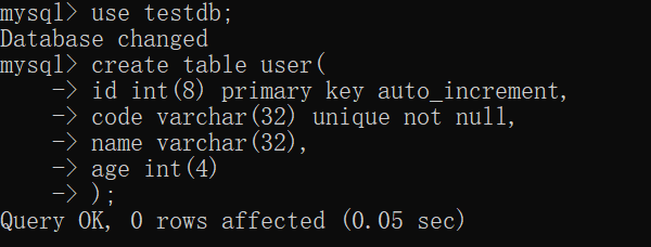 create table user(id int(8) primary key auto_increment,code varchar(32) unique not null,name varchar(32),age int(4));