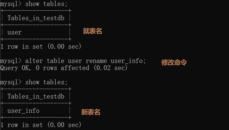 语法:alter table 旧表名 rename 新表名;--把user表改名为user_infoalter table user rename user_info;