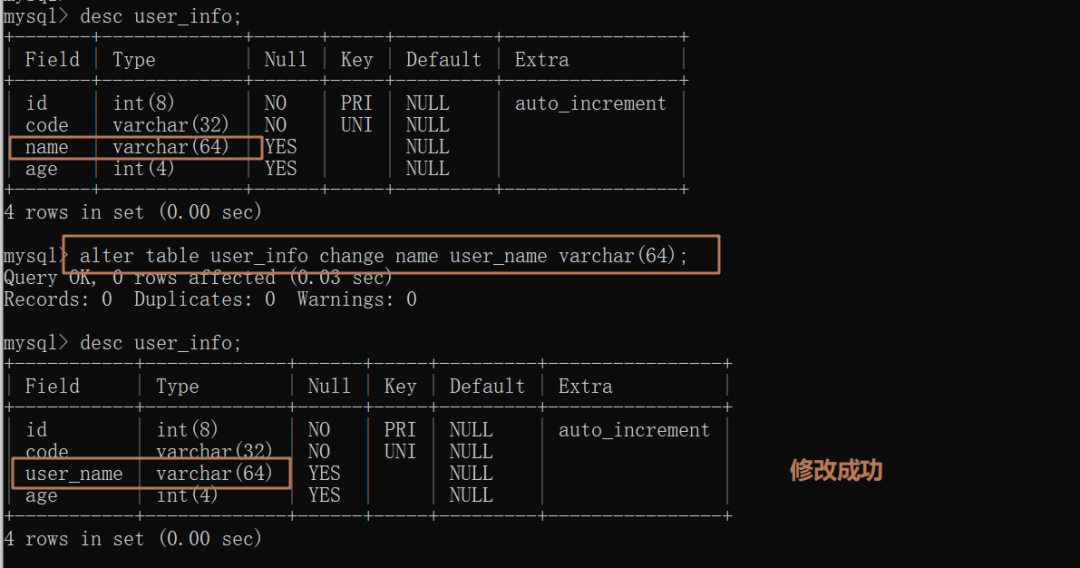 语法:alter table 表名 change 旧字段名 新字段名 数据类型;--修改user_info表的name字段为user_name,数据类型保持不变alter table user_info change name user_name varchar(64);