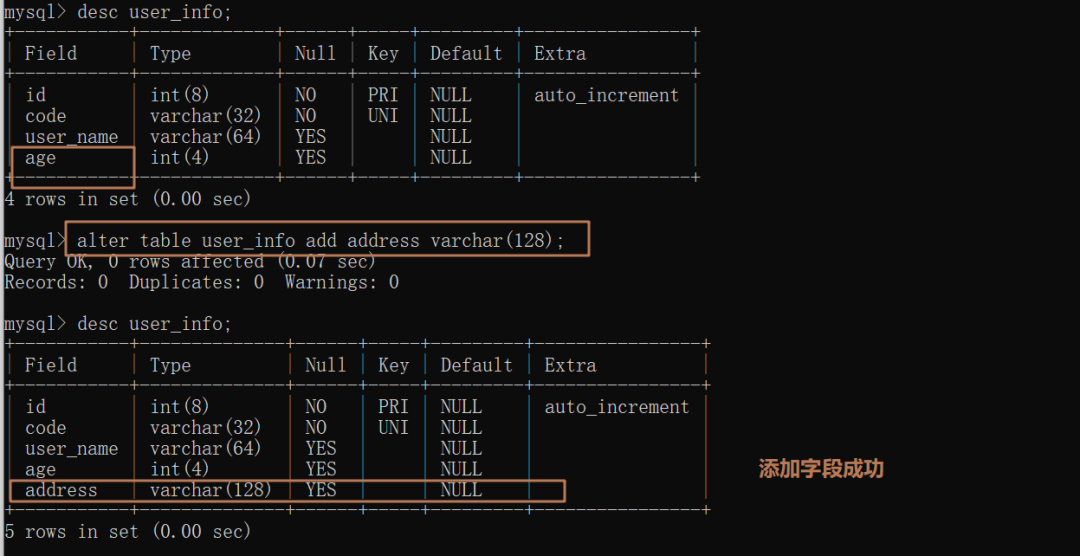 语法:alter table 表名 add 字段名 数据类型;--在user_info表里添加address字段,数据类型为varchar(128)alter table user_info add address varchar(128);