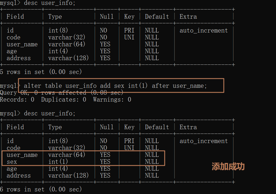 语法:alter table 表名 add 字段名 数据类型 after 指定的字段名;--在user_info表里user_name字段后添加sex字段,数据类型为int(1)alter table user_info add sex int(1) after user_name;