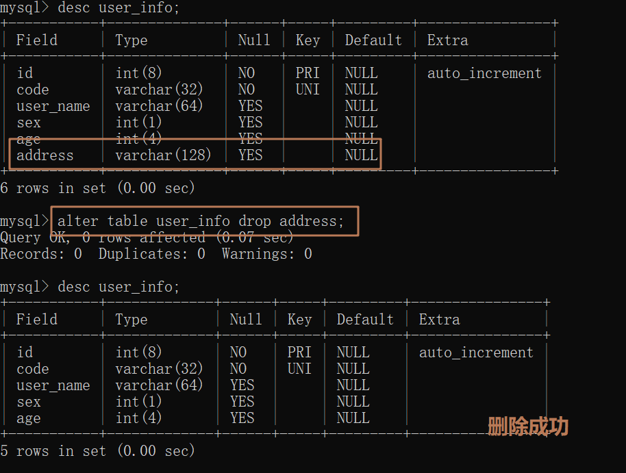 语法:alter table 表名 drop 字段名;--删除user_info表里的address字段alter table user_info drop address;