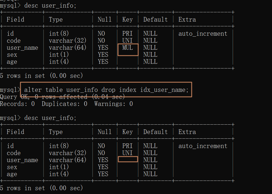 mysql> show tables;+------------------+| Tables_in_testdb |+------------------+| user |+------------------+1 row in set (0.00 sec)mysql> desc user;+-------+-------------+------+-----+---------+----------------+| Field | Type | Null | Key | Default | Extra |+-------+-------------+------+-----+---------+----------------+| id | int(8) | NO | PRI | NULL | auto_increment || code | varchar(32) | NO | UNI | NULL | || name | varchar(32) | YES | | NULL | || age | int(4) | YES | | NULL | |+-------+-------------+------+-----+---------+----------------+4 rows in set (0.00 sec)