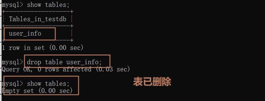 语法:drop table 表名;--删除user_info表drop table user_info;