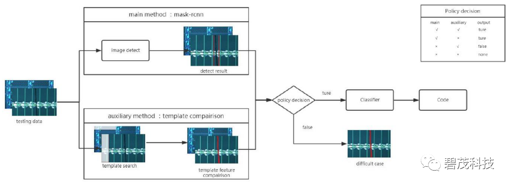 采用基于深度学习的像素级目标检测算法,优点:精度高分类准确,对小目标的检测效果更好。基于机器学习的检测方法可以通过模型迭代训练方式,优化检测精度,减少漏检;通过替换模型或模型重训练的方式,识别新code的需求同时采用基于图像处理的模板比对算法,验证检测算法的准确性和漏检情况,将有问题的数据标记为difficult case用于后面模型的迭代升级。