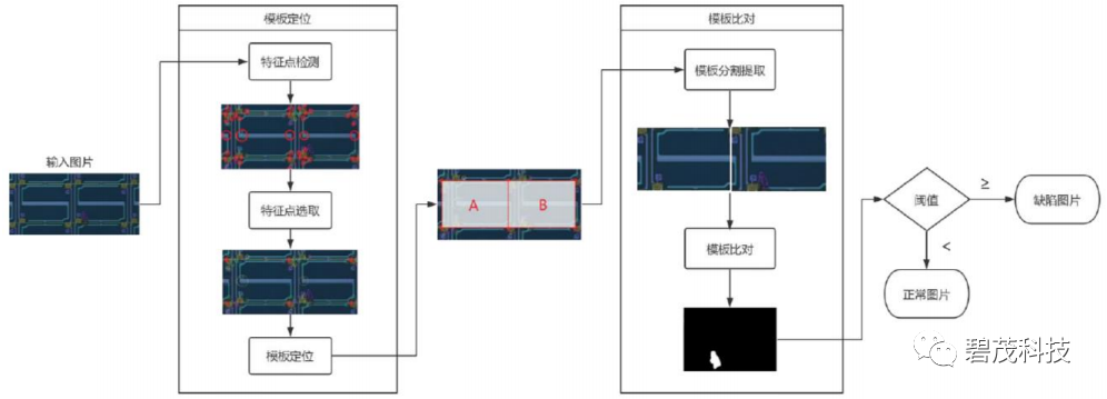2. 模板比对。通过分析图片中所有模板的一致性,确定图片是否为缺陷图片。由于定位误差的存在,设定一个阈值,该阈值需要通过批量数据实验获得。