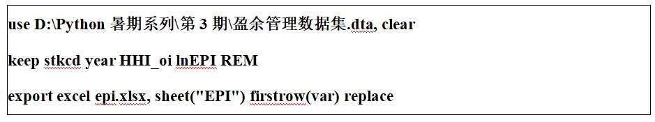 打开Stata17,调入盈余管理数据集,保留上市公司股票代码(stkcd)、年份(year)、赫芬达尔指数(HHI_oi)、环保投资(lnEPI)和真实盈余管理(REM)等5个变量,并将处理后的数据导出为Excel文件,相应操作命令如下。