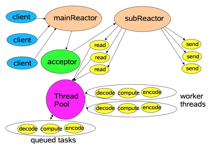该模型相比第二种模型,是将Reactor分成两部分,mainReactor负责监听server socket,accept新连接;并将建立的socket分派给subReactor。