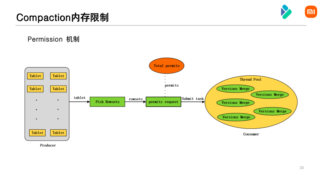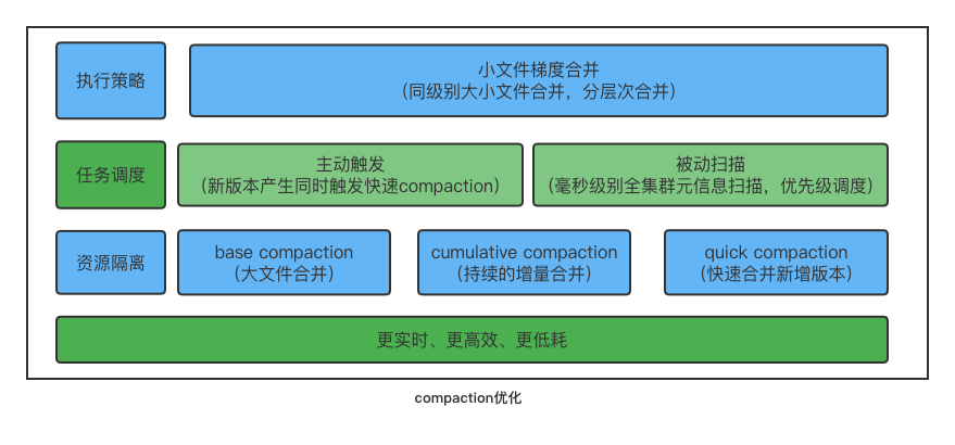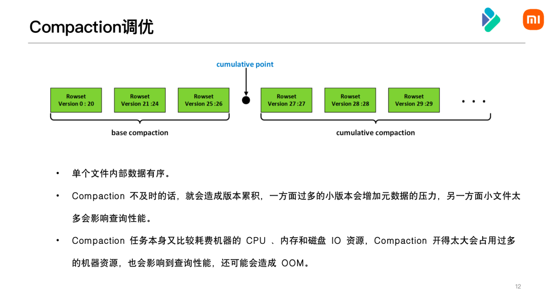 针对不同的业务集群配置不同的 Compaction 参数。部分业务是实时写入数据的,需要的查询次数很多,我们就会将 Compaction 开的大一点以达到快速合并目的。而另外一部分业务只写今天的分区,但是只对之前的分区进行查询,在这种情况下,我们会适当的将 Compaction 放的小一点,避免 Compaction 占用过大内存或 CPU 资源。到晚上导入量变少时,之前导入的小版本能够被及时合并,对第二天查询效率不会有很大影响。 适当降低 Base Compaction 任务优先级并增加 Cumulative Compaction 优先级。根据上文提到的内容,Cumulative Compaction 能够快速合并大量生成的小文件,而 Base Compaction 由于合并的文件较大,执行的时间也会相应变长,读写放大也会比较严重。所以我们希望 Cumulative Compaction 优先、快速的进行。 增加版本积压报警。当我们收到版本积压报警时,动态调大 Compaction 参数,尽快消耗积压版本。 支持手动触发指定表与分区下数据分片的 Compaction 任务。由于 Compaction 不及时,部分表在查询时版本累积较多并需要能够快速进行合并。所以,我们支持对单个表或单个表下的某个分区提高 Compaction 优先级。