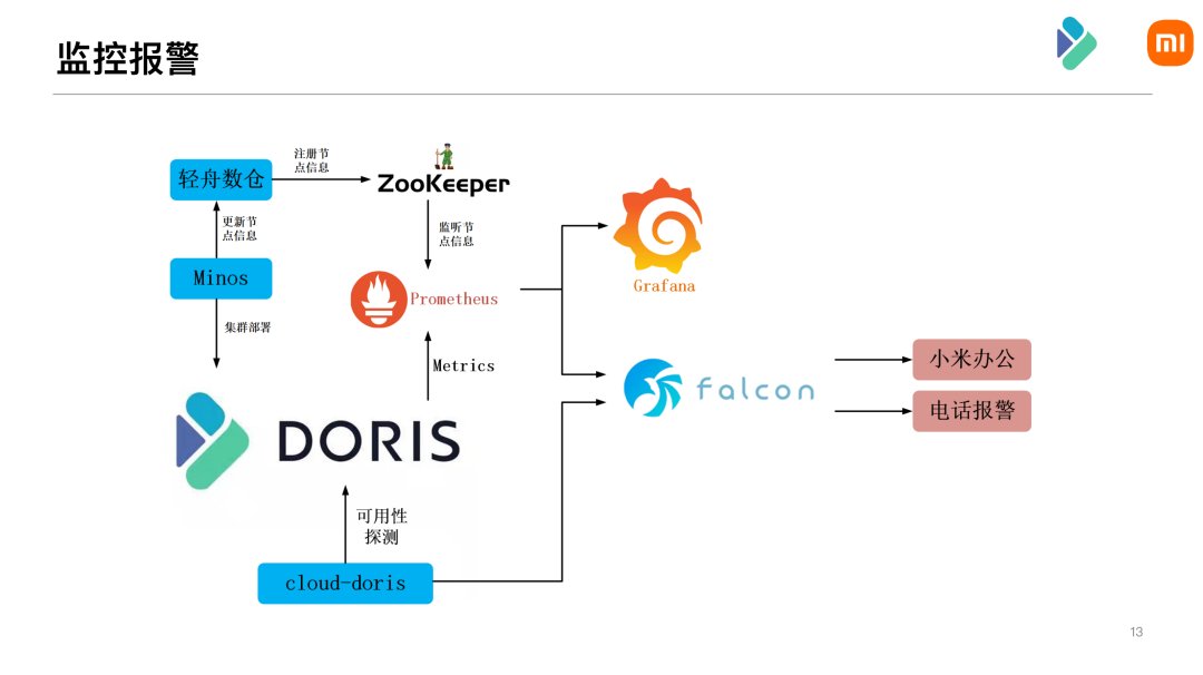 Doris 的监控主要是通过 Prometheus 以及 Grafana 进行。对于 Doris 的报警则是通过 Falcon 进行。
