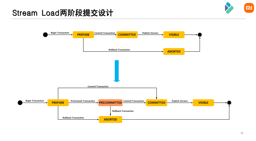 以上两个问题可以通过导入支持两阶段提交解决,第一阶段完成后确保数据不丢且数据不可见,这就能保证第二阶段发起提交时一定能成功,也能够保证第二阶段发起取消时一定能成功。