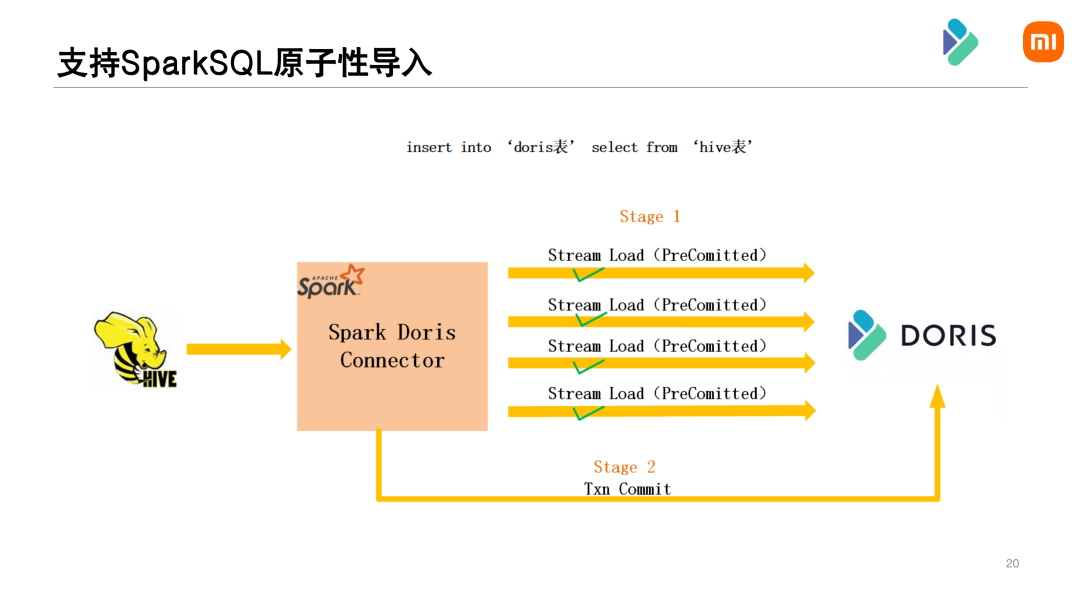 Spark SQL 数据部分导入:通过 SparkSQL 从 Hive 表中查出的数据并写入 Doris 表中的过程需要使用到 Spark Doris Connector 组件,会将 Hive 中查询的数据通过多个 Stream Load 任务写入 Doris 中,出现异常时会导致部分数据导入成功,部分导入失败。