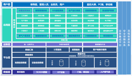 数据层为数据采集服务通过各类通讯协议、数据接口接入现有站控系统、调度系统,以及新建站场、户表、IOT等设备数据。平台层作为系统的统一开发平台,进行数据的运算分析、存储与应用,通过组态式开发完成系统的搭建。运维层进行各类服务的运维管理、负载均衡管理与数据服务共享。应用层为系统模块的具体展示,基于分级权限具体应用,包括综合管理模块、调度运营模块、GIS模块等,后期随时进行新系统的拓展与融合。用户层通过角色分级权限管理,以监控大屏、PC端、移动端方式查看。