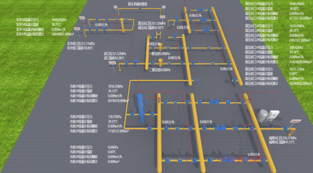 综合管理通过驾驶舱形式展示企业生产运营关键信息;GIS地图呈现管网、场站分布,可查看场站实时重点参数,并快速跳转至工艺流程;数据总览直观查看所有场站的实时数据,报警数据标红提示,一览公司数据情况。调度运营以2D、3D形式还原现场工艺流程,配合视频监控以及分级智能预警,及时了解生产运行情况,通过生产报表管理以及用气分析提供智能调度建议,进行管网泄漏监测,报警自动升级推送以确保燃气供应安全。