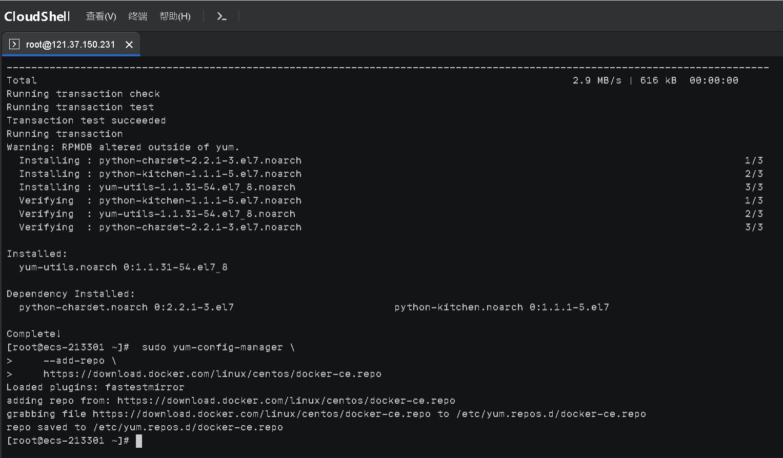 sudo yum install -y yum-utils sudo yum-config-manager \ --add-repo \ https://download.docker.com/linux/centos/docker-ce.repo等仓库设置完成后,就可以安装Docker,如下命令安装最新版本