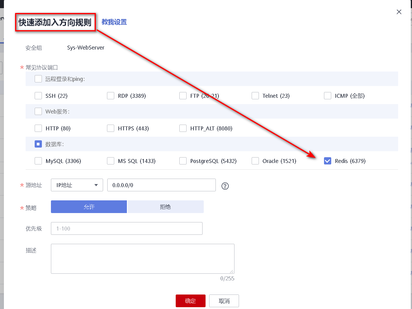 docker ps可以看到用到的端口号为6379,这个端口默认需要在安全组设置,华为云ECS的安全组考虑的比较周到,可以通过快速添加规则,把Redis的6379端口加到规则中。