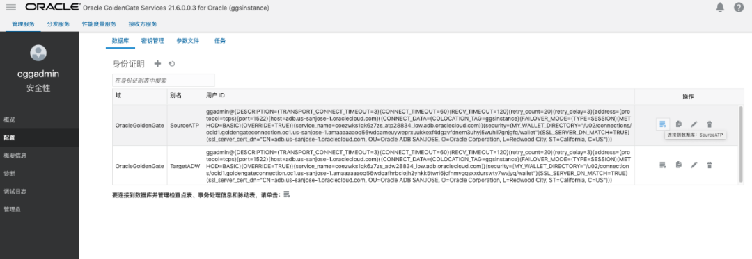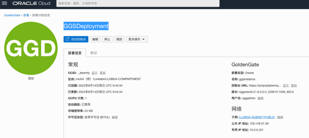 从OCI导航栏>数据库>GoldenGate>部署,打开第一篇部署的GGSDeployment实例