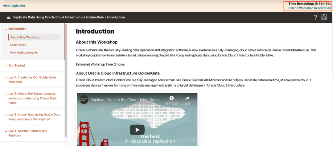 进入课程后,按照页面左侧的菜单栏步骤依次学习和操作即可。右上角有课程环境的倒计时,若不能在3小时内完成,别忘记点击Extend Workshop Reservation延时, 每次点击可以延长一个小时,总共可以点击三次。