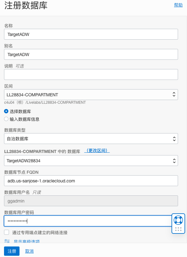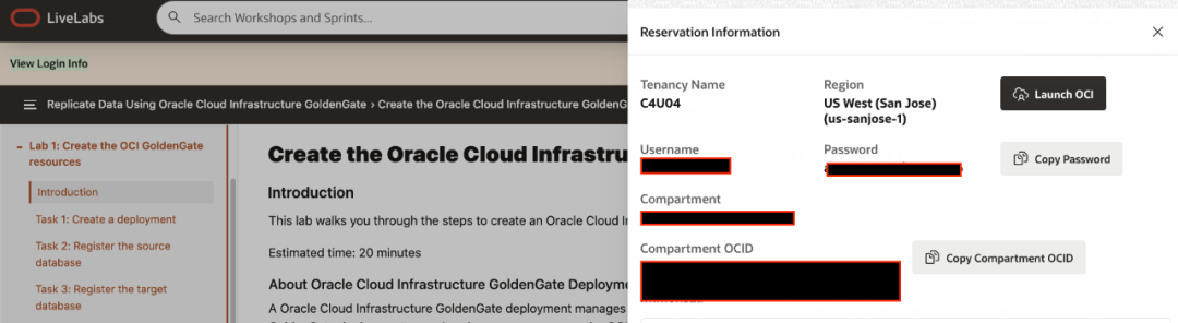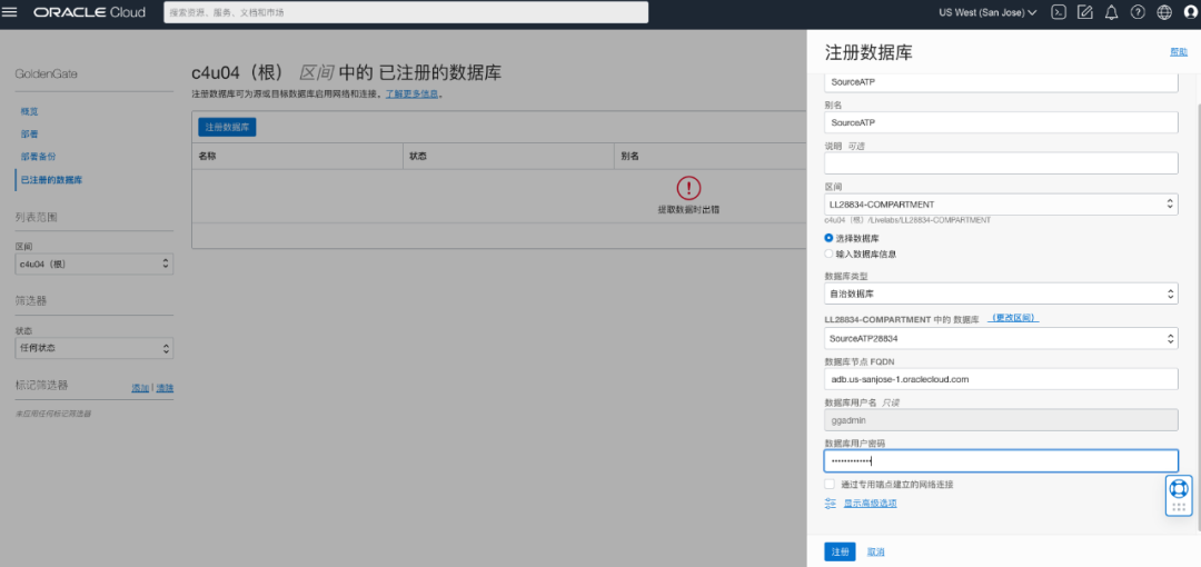 注意区间选择同GoldenGate创建时的选择保持一致,数据库用户密码从View Login Info中获取