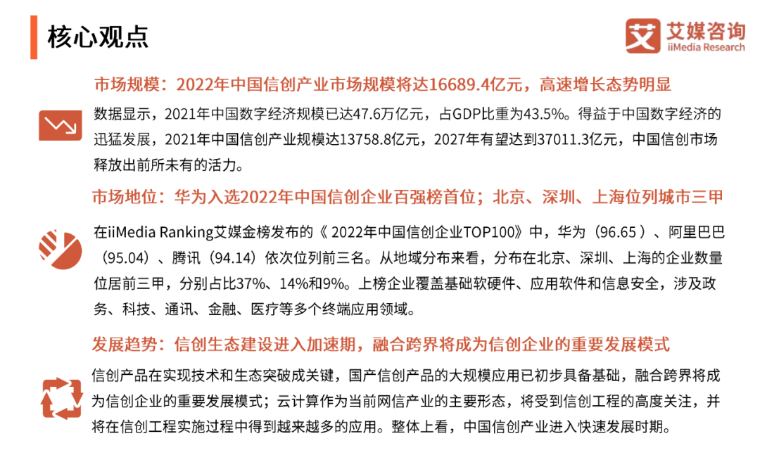 市场地位:华为入选2022年中国信创企业百强榜首位;北京、深圳、上海位列城市三甲
