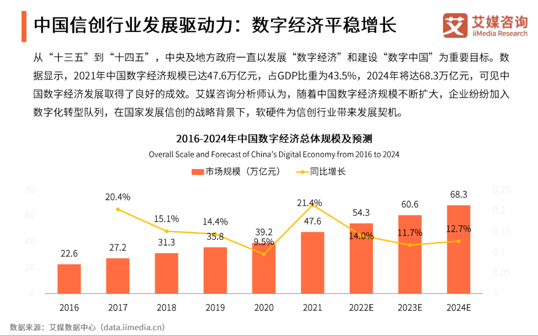 市场规模:2022年中国信创产业市场规模将达16689.4亿元,高速增长态势明显数据显示,2021年中国数字经济规模已达47.6万亿元,占GDP比重为43.5%。得益于中国数字经济的迅猛发展,2021年中国信创产业规模达13758.8亿元,2027年有望达到37011.3亿元,中国信创市场释放出前所未有的活力。