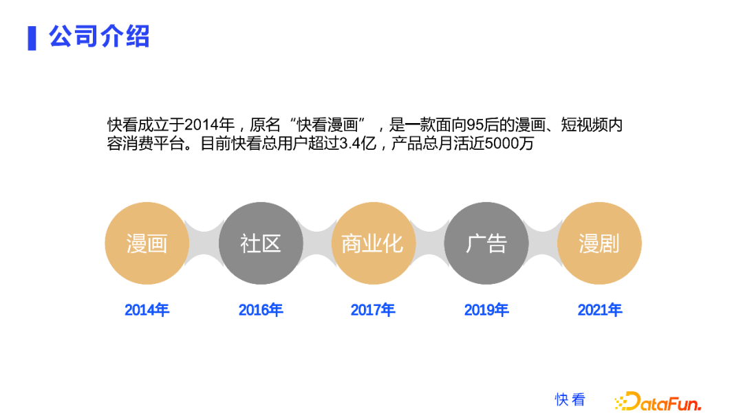 我们的业务线比较多,从时间线来看,包括了2014年做漫画,2016年开始做社区,从 2017 年到现在,商业化又是我们重点发力的一个方向,包括了2019年广告商业化, 2021年快看又宣布品牌升级,从一个漫画平台升级成了漫画加短视频加兴趣社区这样一个综合性的一站式内容消费平台,这是在两个月前进行的产品升级,引入了更多的漫剧短视频形态。