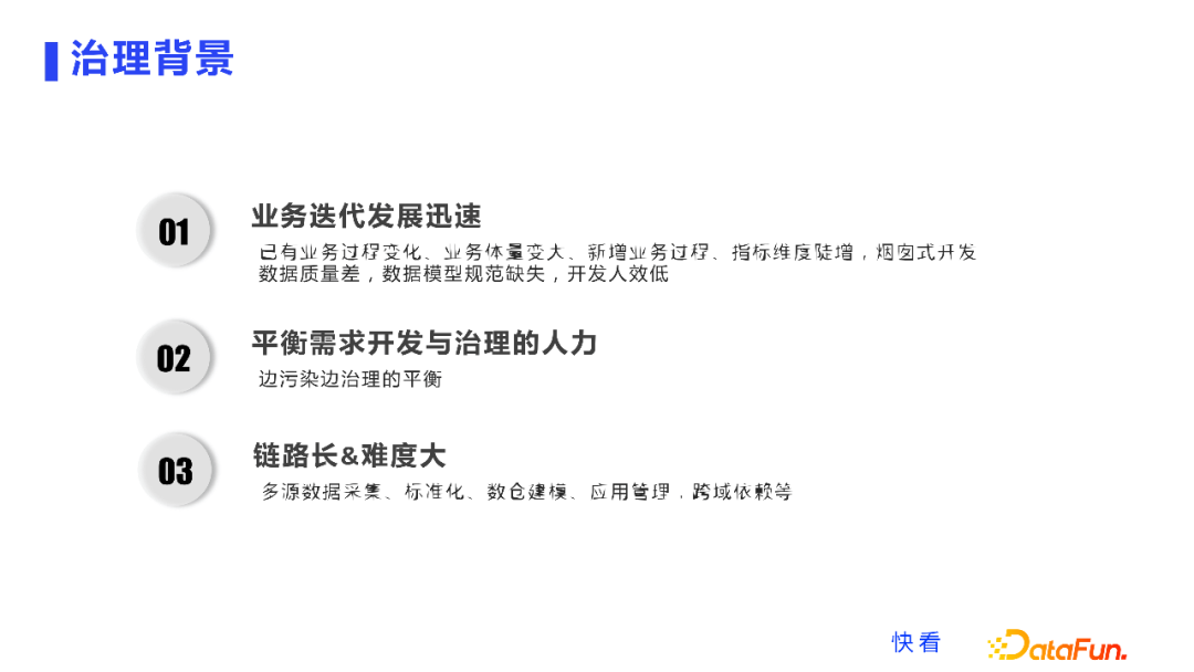 公司的发展会带动业务的快速发展,同时也会带来数据建设方面的一些问题,这也是我们进行数据治理的背景。