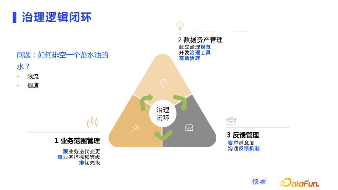 首先前提是排水口一定要比进水口的速度快。刚才也提到我们现在是边污染边治理,我们需要保证数据污染的速度是要小于数据治理的速度的。对于蓄水池这个例子来说,就需要对于入水口进行限流限速,对排水口进行提速,其实这样就引出来了我们的逻辑闭环的一个基本数学原理,也就是在数据治理的过程中,要保证数据污染的速度在经过治理之后是越来越小的,而数据治理的速度是越来越高的,这样才能保证数据治理的越来越好。
