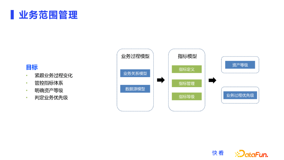 首先业务范围管理的目标,是保证数据侧能够紧跟业务过程的变化。然后根据指标体系的指标等级,明确这些业务过程、数据资产的等级是什么,我们还可以根据指标的优先级去判定业务需求的优先级。