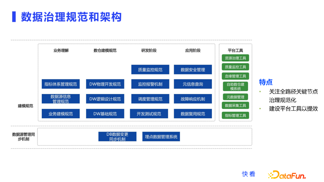 再往上就是采集完数据之后,数据建设和治理的阶段,我们要了解业务,要对业务进行建模,因此需要业务建模规范、数据源信息管理规范。另外,指标体系也需要进行管理,这是我们的业务理解部分。