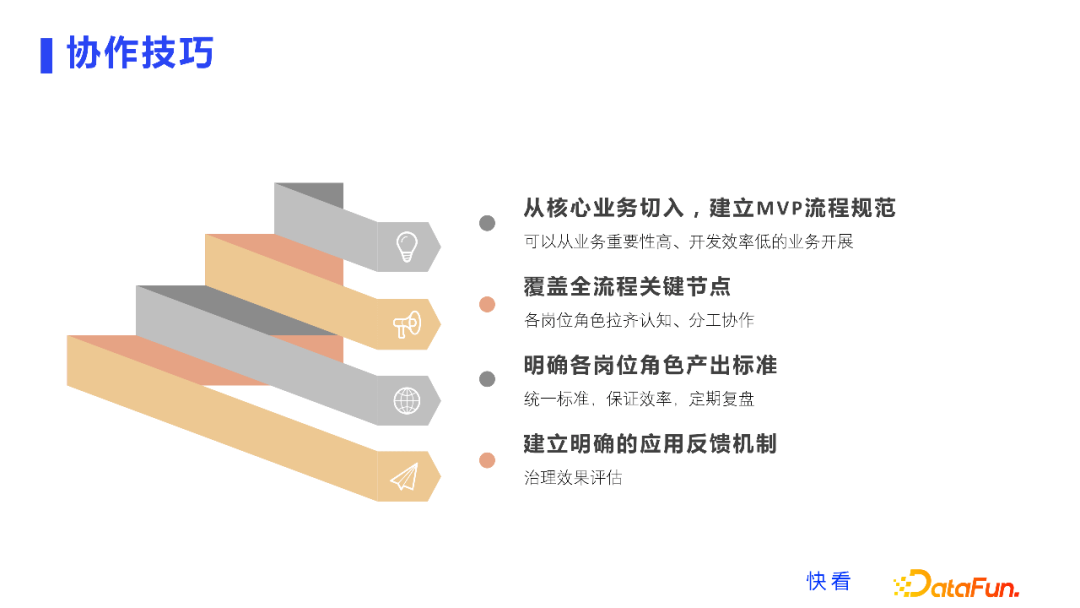 数据治理的链路很长,它需要数据产品分析师、开发同学,以及业务同学进行很好的协作。在这个过程中,需要我们能够从更高的视角,把这些团队协作起来,我观测到这是数据治理工作成败非常核心的一个点,而且从行业交流里面也发现这是很多公司的数据治理没法开展的一个原因。产品侧没有意识到这一点,不去配合,没有拉齐这方面的认知,数据开发同学就没有办法全力投入。因此需要覆盖全流程的关键节点,需要各个岗位角色拉齐认知、分工协作。在各个团队各个角色拉齐认知之后,我们要用一个闭环思路持续的去跟进,需要找一个切入点,在人力有限的情况下,建议从核心业务切入,建立MVP的流程规范,从重要性高、开发效率低的业务开展,能够让各个团队参与进去之后,快速地看到效果。最后明确我们各个岗位角色产出的一个标准,统一标准,保证效率,然后大家定期复盘,最后建立明确的应用反馈机制,去进行治理效果的评估和量化。