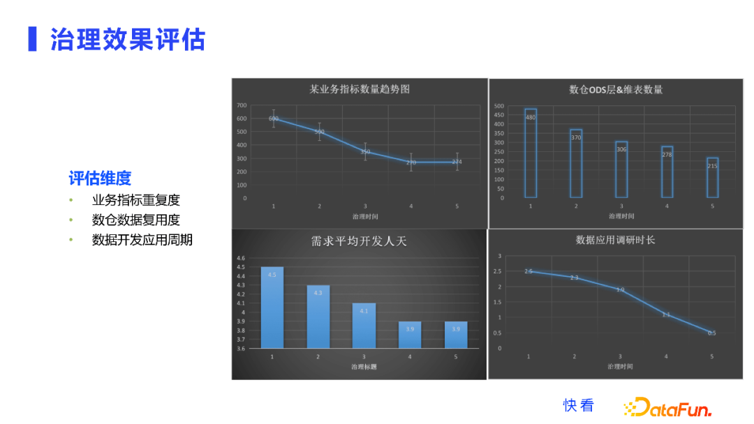 开发应用的周期:在上图大家可以看到,业务指标通过治理,持续削减,并且最后相对稳定。当然随着业务变化、业务过程的变化,它可能还会增,但是管理起来之后就能减少很多不必要的指标。我们数仓的各层数据和维表相关的数量,以及它的复用性,也能够得到明显改善。最后需求开发的人天和数据应用的调研时长,也持续下降。因为我们的数据地图更清晰了,大家使用数据、查数据、对数据口径确认也更快速。