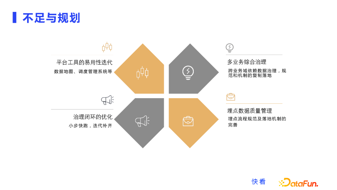 另外是持续优化,我们的策略是小步快跑,迭代补齐,刚才提到的三个步骤中的各个规范,它的框架都在不断完善中。最后是一个细节点,我们提到的数据源里面,埋点数据质量的管理,它的流程规范和落地机制,我们也在大力的去跟进完善,这毕竟是我们数据质量的一个源头,目前取得了一定效果,但仍需要去进行业务侧的推进和落地。
