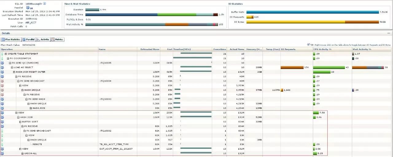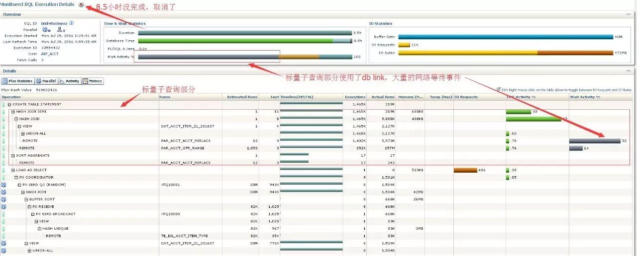 sql monitor中显示的执行计划,8.5小时仍未执行完: