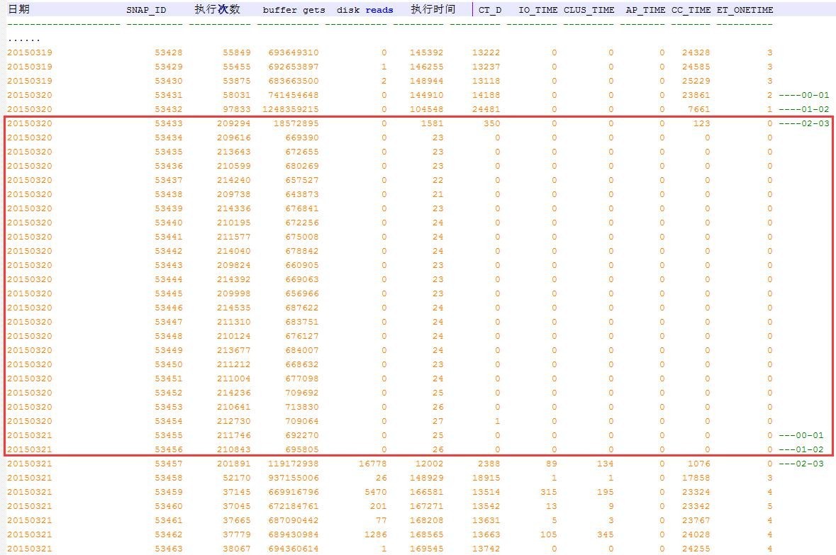 因为AWR在当前系统只保留一周,4月1日案情重审时已经找不到19日和20日的执行计划,只有一些当时分析问题时收集的SQL执行效率的数据,红框内20日的SQL执行效率高前后两天19日和21日好多2倍: