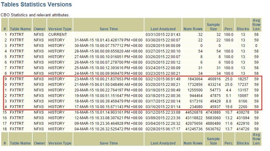 根据sqlhc工具收集的信息,下面FXTTRT表的统计信息的历史数据可以说明,17日到23日,表的数据在持续增长,20日发生truncate表操作的可能性非常小(除非先对表做了备份,truncate表后,在收集统计信息前又重新插回来):