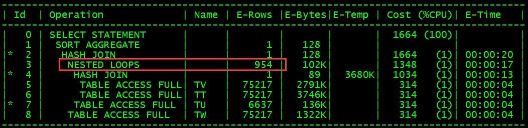 真实案例的情况是:SQL正常执行时间3.4分钟,某天TV表delete一些记录后,执行了将近20分钟还没有完成,而其中最重要的变化就是执行计划其中的一个hash join变成了nested loops,虽然hint中已经指定全部表要use_hash。