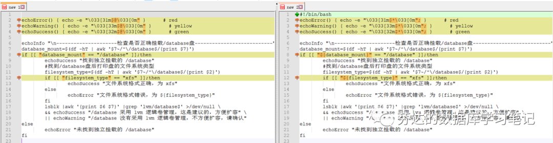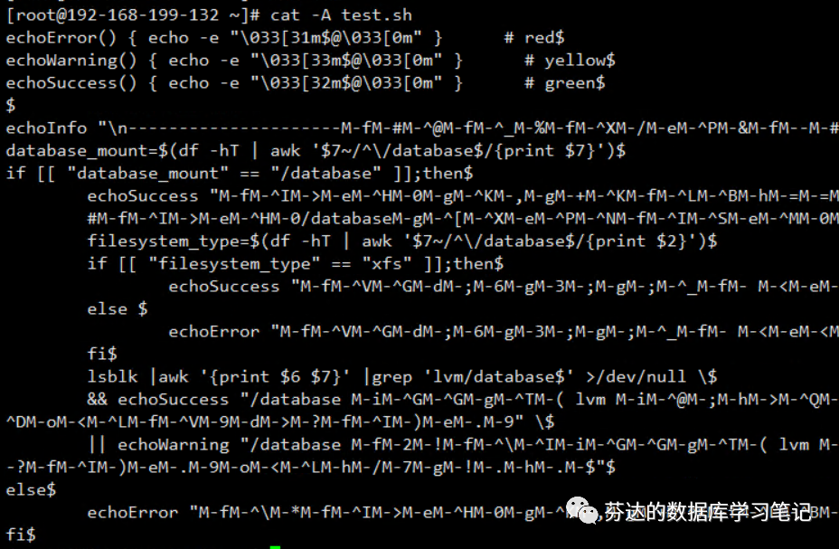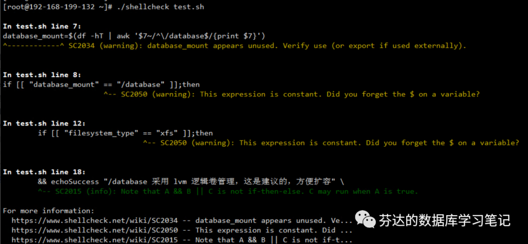 我的代码要实现的功能是,检查服务器磁盘数据目录 database 的挂载情况,如果 database 目录未独立挂载则输出 error,如果 database 目录独立挂载,则继续判断是否是 xfs 文件系统格式挂载,不是的话则输出 error,再判断是否适用了 lvm 逻辑卷管理,不是的话则输出 warning,其余情况输出 success。