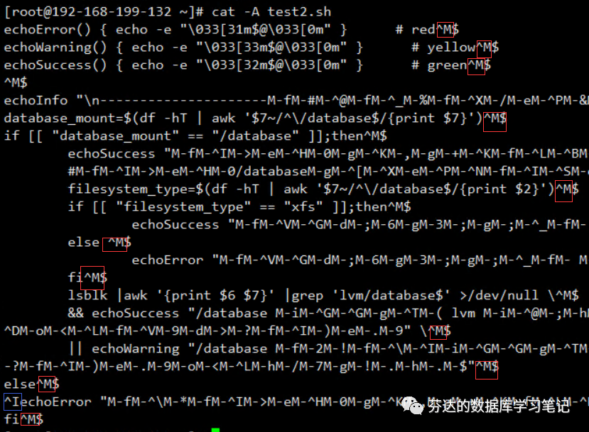 "^M"也可以理解为 windows 的特殊换行符了,^I 表示 tab 制表符(倒数第二行,蓝色方框,为了演示我这里故意偷偷替换了一处空格为制表符)。