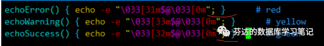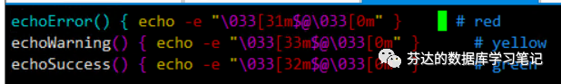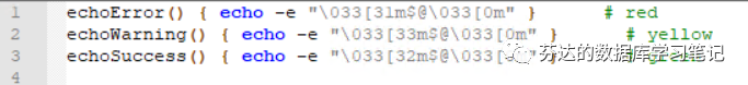 代码一开始,先定义 3 个颜色输出函数,红色为 error 级别,黄色为 warning 级别,绿色为 success 级别。