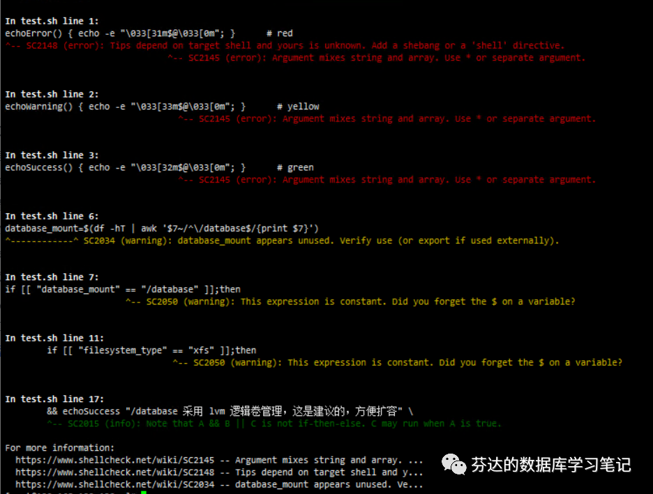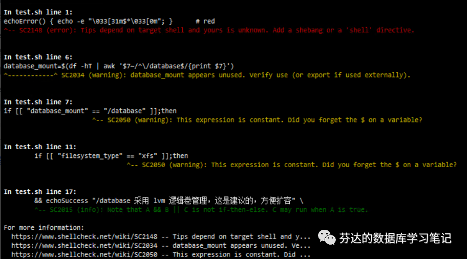 由于我能确保我的第一个逻辑(黄底字)语法正确,并且我的否则逻辑只是输出告警文本,而不是执行一些变更性的命令,影响不大,我不打算修改调整了。但我确实从 shellcheck 学会和记住了这个写 shell 时要注意的坑。