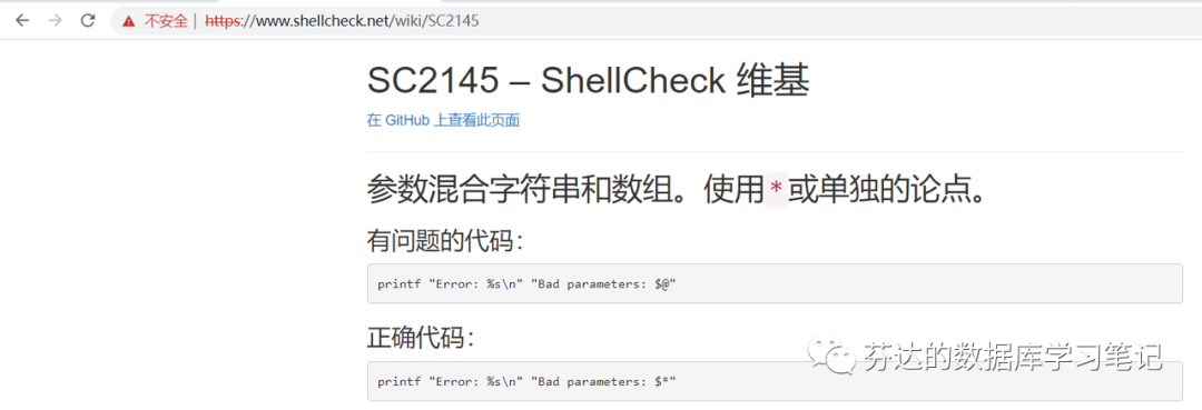 报错的编号是SC2145,有红色的简单的文字说明,而最底下有个链接,可以去官网上看详细的原因说明。