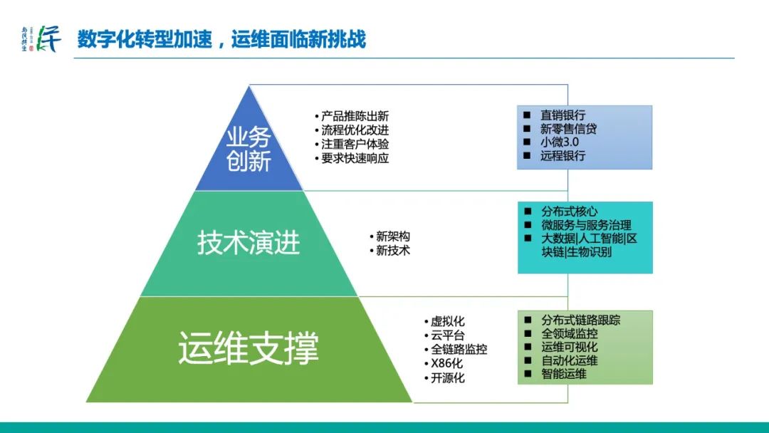 总体来说,随着产品推陈出新和流程优化改进,银行业务越来越注重客户体验,能够快速响应客户需求,提供更优质的银行服务。而这些服务和系统都运行在数据中心,数据中心的各种设备、技术栈和系统关系越来越复杂。从物理服务器到虚拟化云平台,从商业产品到开源技术,从集中式架构到分布式架构,这些都给运维带来了更大的挑战。如何应对新挑战是我们当下面临的严峻课题。