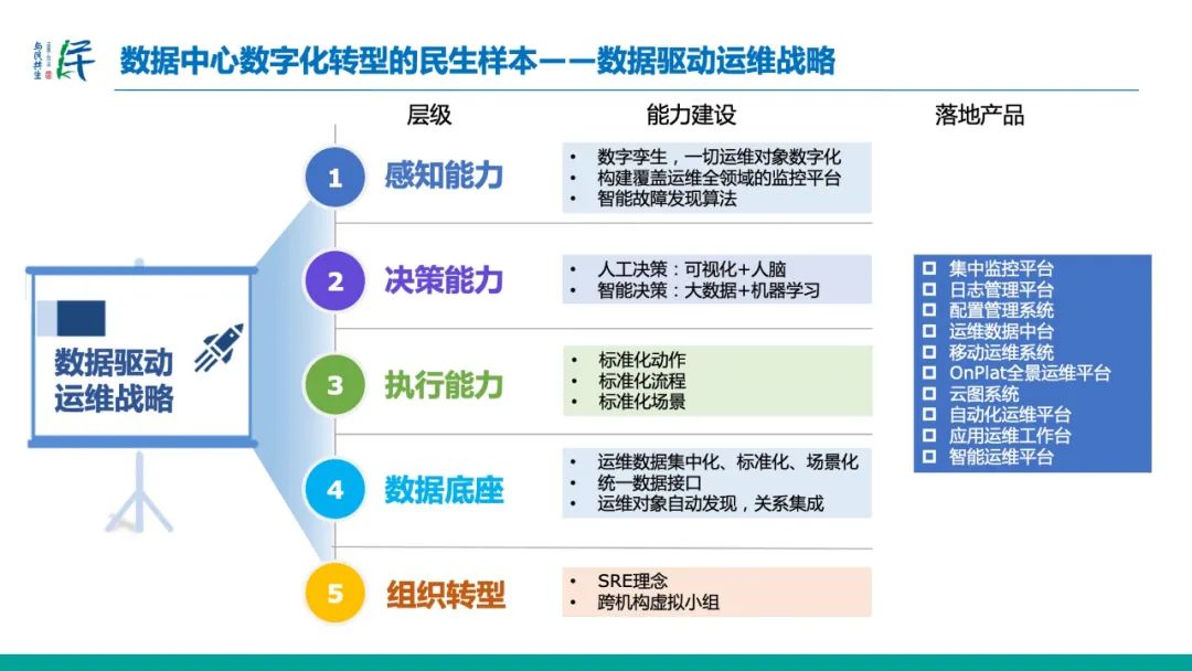 我们认为,数据驱动运维的落地不单单依赖一个简单的平台,而是数据中心所有工具平台的有效整合和集成。上图右侧“落地产品”就是目前我们采用的一些平台和工具。