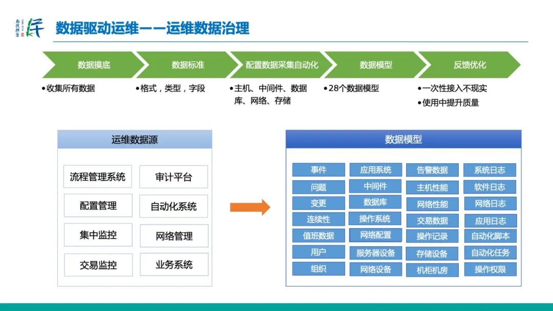 这里,再跟大家分享一下数据底座的建设。我们大概从2018年开始做数据底座建设,遇到很大的问题是运维数据治理。我们之前的运维数据标准化程度不够高,想用算法消费数据来提供感知和决策能力时,就必须先做数据治理。因此,我们对所有的数据做了摸底,建立运维数据的标准,并且通过自动化程序和配置采集程序来采集标准数据,经过加工汇总到28个数据模型,最后汇聚到数据运维中台上,对外提供数据消费的接口。接下来做智能运维,数据直接来自于数据中台的数据服务。这个过程中,数据治理是难度比较大的一件事情,我们花了很大精力,目前也在根据一些运维场景不断地优化和完善。