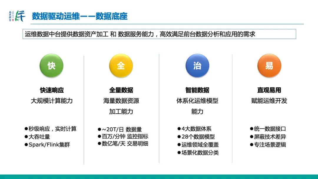 其二、全量数据,目前每天有20TB的数据量,每分钟有百万级的监控指标,每天有数亿笔的交易明细,这些全部集中到数据底座进行加工;