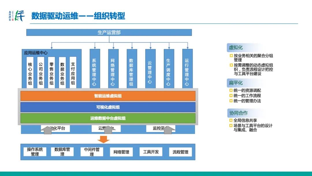 接下来谈一下组织转型,下图是我们实际的行政组织,应用运维中心是按照银行业务划分的组,其他是按照技术条线进行分组,我们在做数据驱动运维转型的时候,形成了跨各个中心的运维数据中台虚拟组、智能运维虚拟组和可视化虚拟组,分专题进行专项攻关。对于运维工具的建设,我们站在整个数据中心层面来统筹安排,协调资源,统一建设。现在看起来,这种方式取得了比较好的效果。
